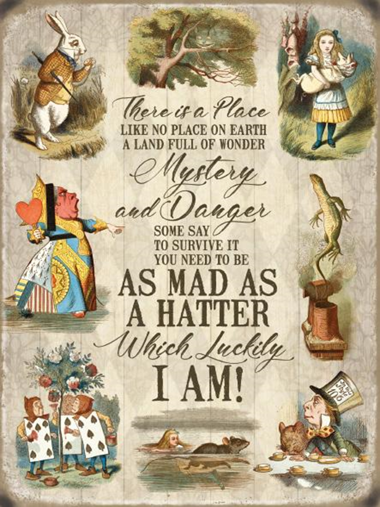 Traditional style Alice In Wonderland Metal Wall Sign has four fixing holes, or you could use wire or jute string for ease of hanging. Alice In Wonderland Metal Sign. There is a place like no place on earth, a land full of wonder mystery and danger. Please contact us for payment information.