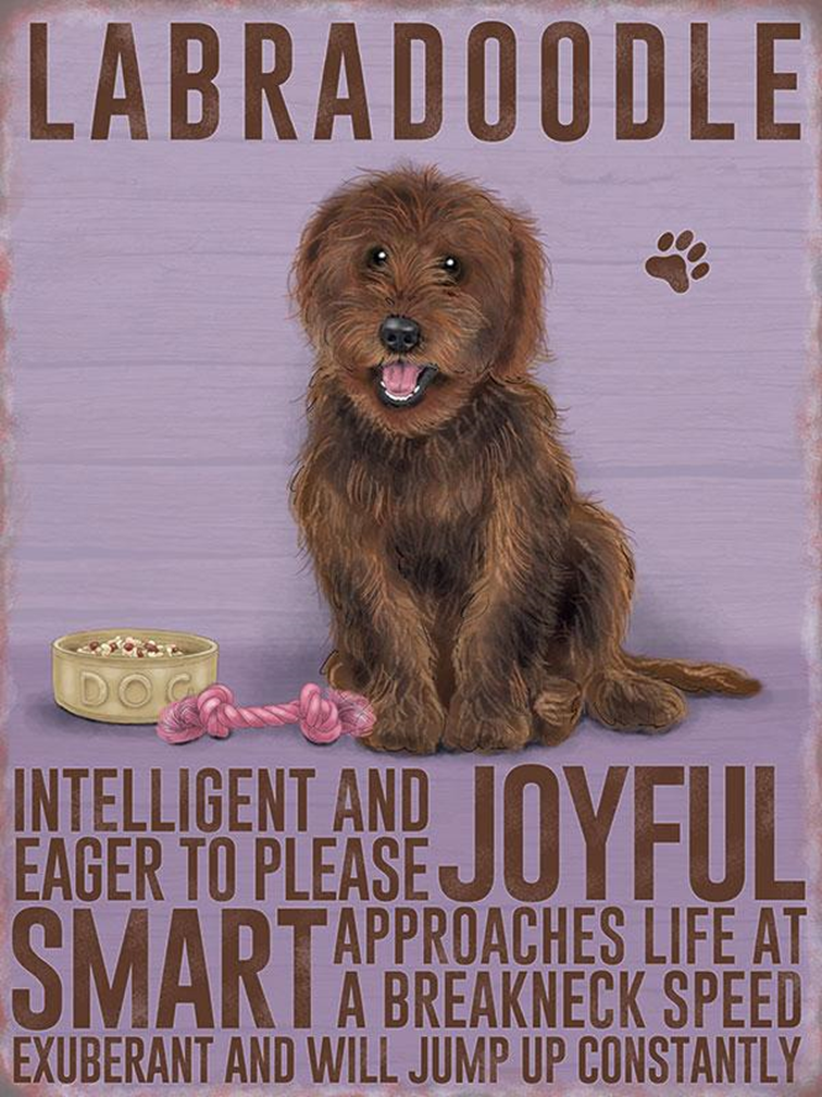 Traditional style Brown Labradoodle Metal Wall Sign has four fixing holes, or you could use wire or jute string for ease of hanging. This Metal Sign describes the Brown Labradoodle as being Intellegent and eager to please JOYFULL, SMART approches life at a breakneck speed exuberant amd will jump up constantly.