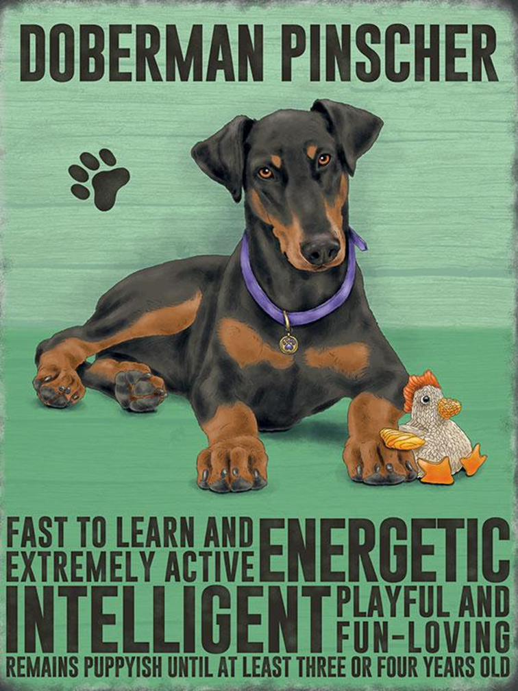 Traditional style Doberman Pinscher Metal Wall Sign has four fixing holes, or you could use wire or jute string for ease of hanging. This Metal Sign describes the Doberman Pinscher as being fast to learn and extremely active ENERGETIC, INTELLIGENT playfull and fun-loving remains puppyish until at least three or four years old.