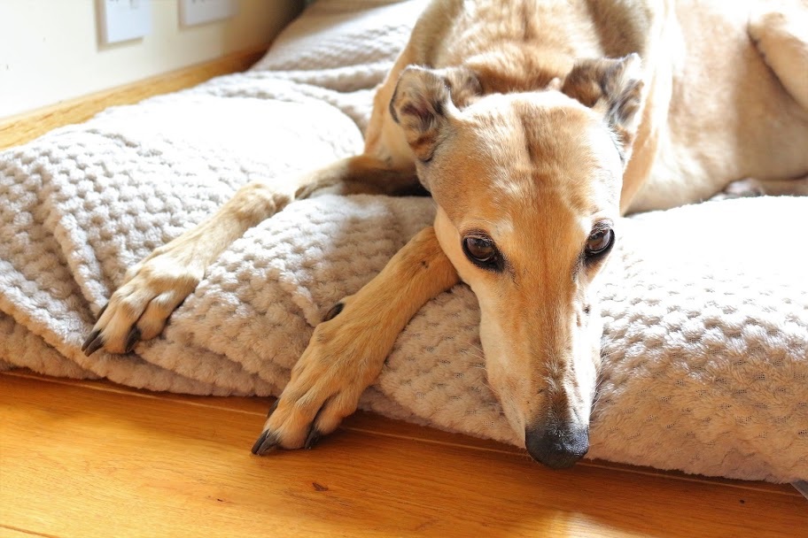 LUCY came to us from the Waltham Abbey branch of the RGT (Retired Greyhound Trust) on 17th February 2018 aged 10 years old. I had been trying to track down the lady, Sue Tipton, from whom we had Manor to tell her the sad news that we had lost the dear lad and to say that we would like to help another elderly greyhound, but I got through to a different lady who in turn passed my details to a liaising officer who asked if we could help Lucy whose owner had sadly had to be hospitalised due to dementia. Lucy had been returned to the kennels, previously to that I understand that after her racing days she had lived in a flat in London and was covered in mange, she also has lots of old scars so she probably didn’t have a very happy life before going to the RGT. I thought that she might be quite sad at losing her home and her kind owner too but she seems to take everything in her stride and she is an absolute dream of a girl who ‘slotted in’ immediately, she is a very happy and easy going hound who is a joy to have around. Her teeth were in quite a state when she went back to the RGT and although she had a dental before coming to us, she has since needed another, costing several hundred pounds because she had to have lots more teeth removed, again I was worried about her but she is one of those ‘get on with it’ kind of dogs. Her racing name was Nothing To Offer but she most certainly has a great deal to offer, she is a beautiful, affectionate girl with a gentle nature and we all love her dearly. Thank you to Joy at Barley Kennels for kindly arranging transport to get her here and thank you to David for bringing her, it’s quite a journey from Essex but Lucy was very relaxed and came in and made herself very much at home.