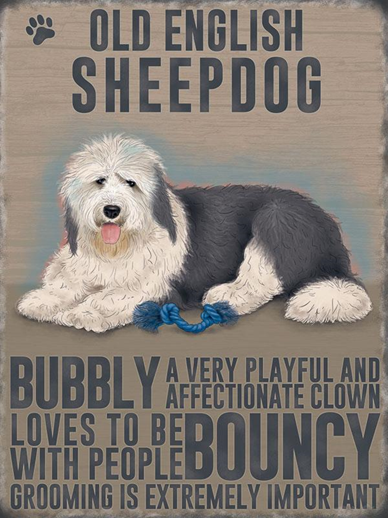 Traditional style Old English Sheepdog Metal Wall Sign has four fixing holes, or you could use wire or jute string for ease of hanging. This Metal Sign describes the Old English Sheepdog as being BUBBLY a very playful and affectionate clown, loves to be with people BOUNCY grooming is extremely important.